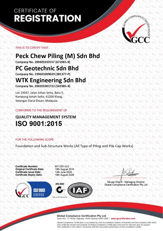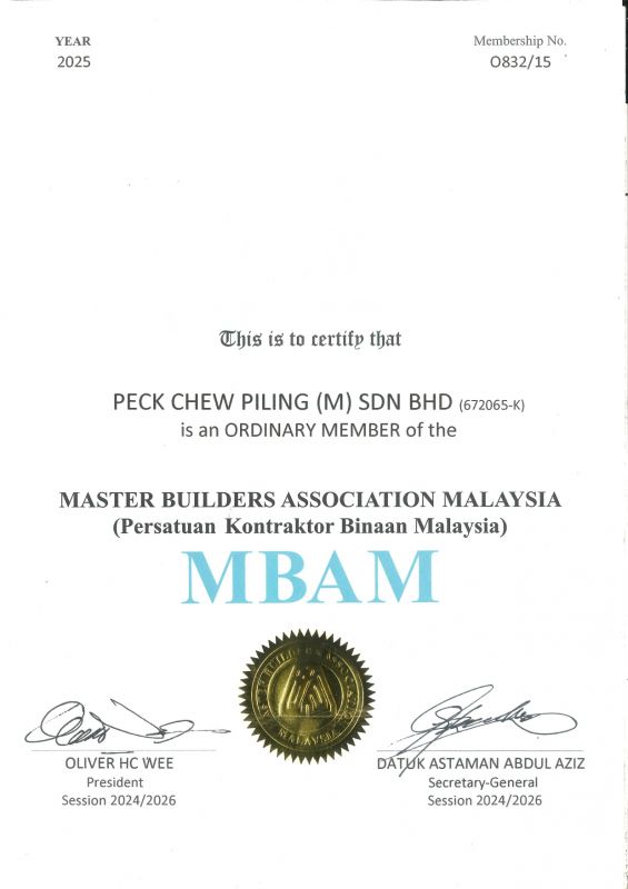 Headquarted in Malaysia, Peck Chew Piling (M) Sdn. Bhd. formerly known as Tan Pek Chu Piling which founded in 1975 by Mr. Tan Pek Chu at Johor Bahru that carried out timber and bakau piling using A-Frame. We were then cooperated in 2004 at the central region of Malaysia and actively involved in foundation construction works for various type of building or for infrastructure across peninsular Malaysia. In 2010, we expanded our business to East Malaysia and setup the first office there.